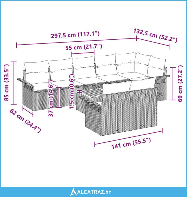 - Delivery Contains: 3 x središnje sjedište s pohranom, 1 x kutno sjedište s pohranom, 4 x naslon kauča s pohranom, 1 x vrtni stol