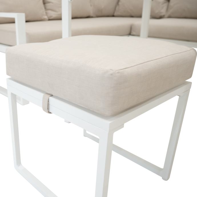 Izrađen od visokokvalitetnog aluminija s praškastim premazom, okvir je čvrst, ali lagan, što osigurava izdržljivost, a istovremeno ga je lako premjestiti i rasporediti. Kutni sjedaći set dolazi u dva dijela i lako se spaja pomoću priloženih remena za stabilnu i kohezivnu postavku. Plišani jastuci dodaju iznimnu udobnost, s uklonjivim navlakama koje imaju praktično zatvarač za jednostavno pranje ruku. Taburei nude dodatne mogućnosti sjedenja i dizajnirani su s sigurnosnim remenima koji čvrsto drže jastuke na mjestu, sprječavajući neželjeno pomicanje tijekom sjedenja.