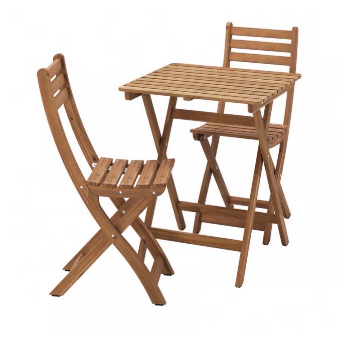 Prodajem IKEA Askholmen set koji uključuje 2 stola i 4 stolice, izrađene od drva u toploj smeđoj boji. Sve je sklopivo, što je praktično za pohranu kada nije u upotrebi.