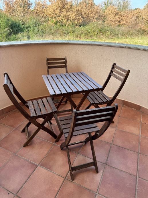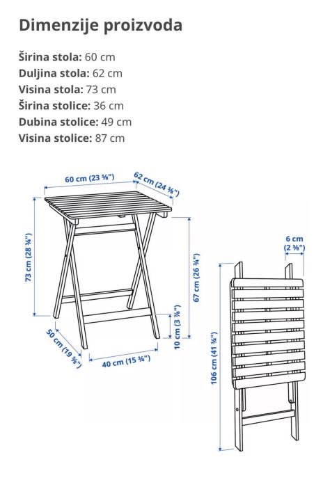 Prodajem IKEA ASKHOLMEN set koji se sastoji od dva sklopiva stola i četiri sklopive stolice. Set je izuzetno praktičan i kompaktan, a kada se sklopi zauzima jako malo prostora, što je idealno za balkon, terasu, apartman ili manji stan.