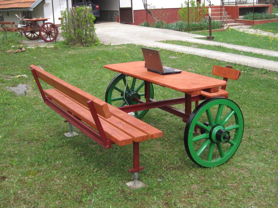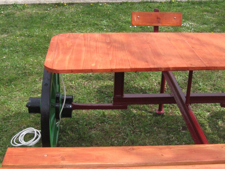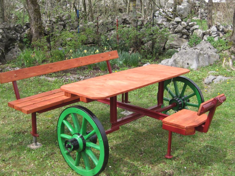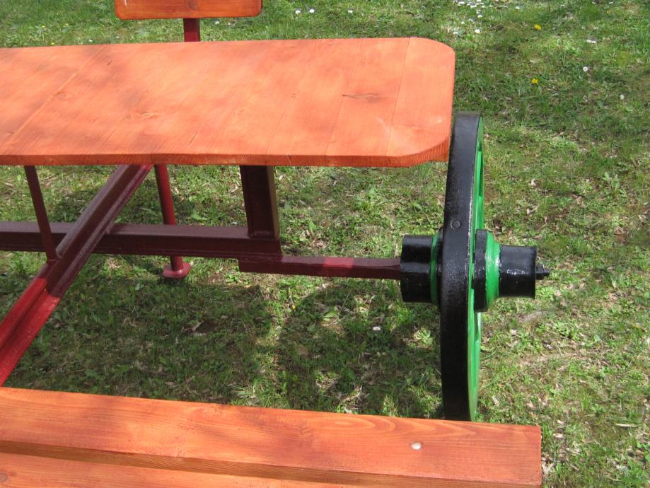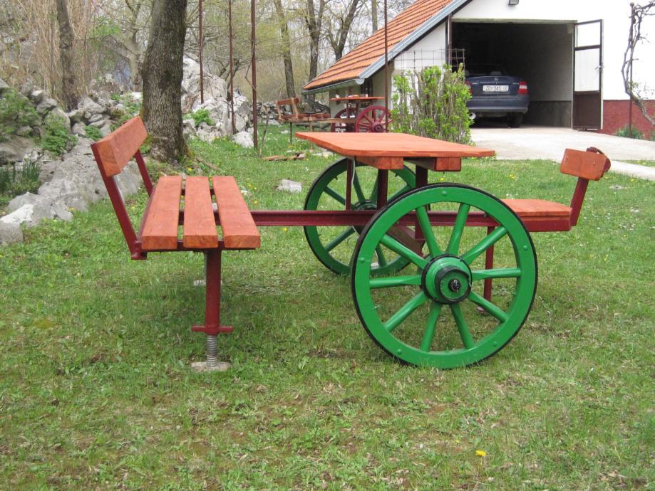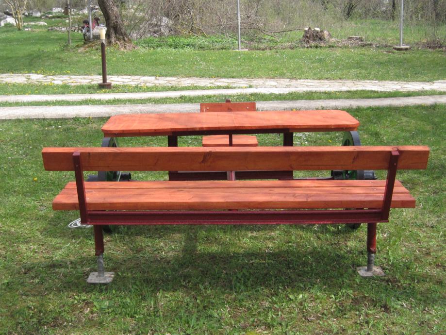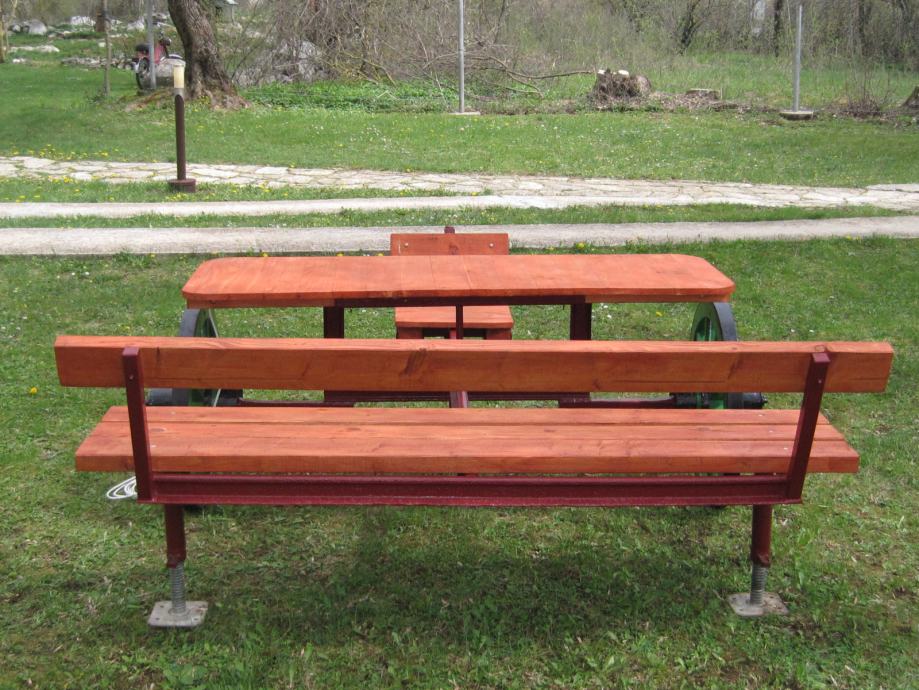 Konstrukcija je napravljena od šina usko-tračne željeznice iz doba Austro - Ugarske monarhije . Jedna šina je iz željezare " Zenica " , što je dokaz da se na ovim terenima nešto i radilo .. Ideja je bila napraviti nešto što će trajati .. Ovo je druga garnitura ., prvu možete vidjeti u mojim oglasima .. Godinama ne morate ništa dirati , snijeg , kiša sunce ostaviće tragove ali značajnije neće ništa ugroziti .. Ja takvu garnituru imam već 10 g , ove godine sam promijenio stol koji je napravljen od brodskog poda .. Gabariti su otprilike 2,20m *2,20 m .. Težina ne manje od 250 do 300 kg ..