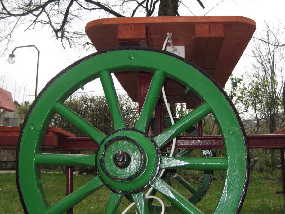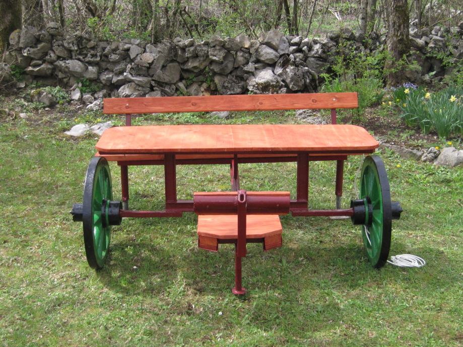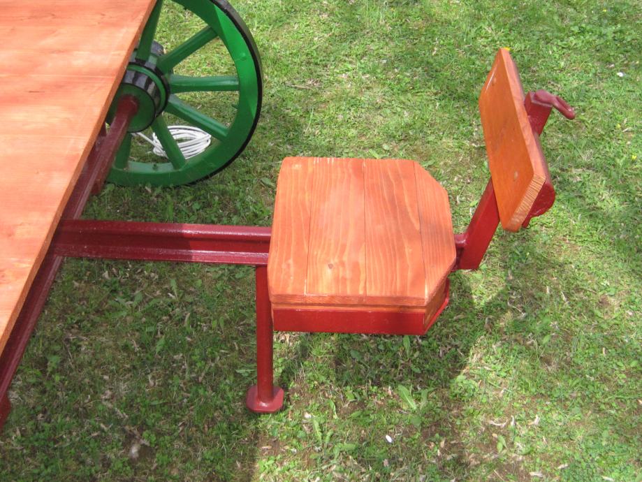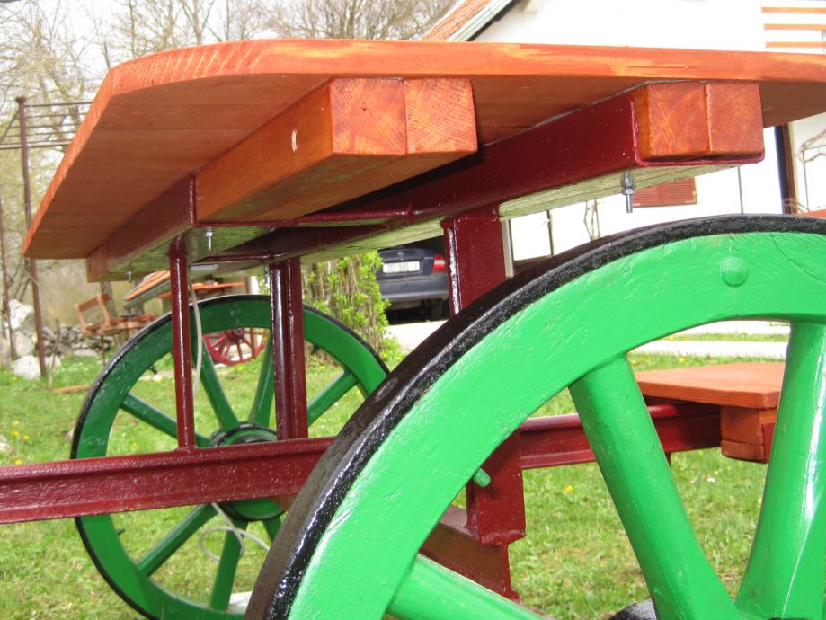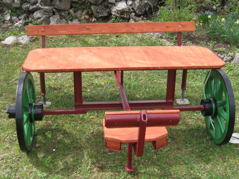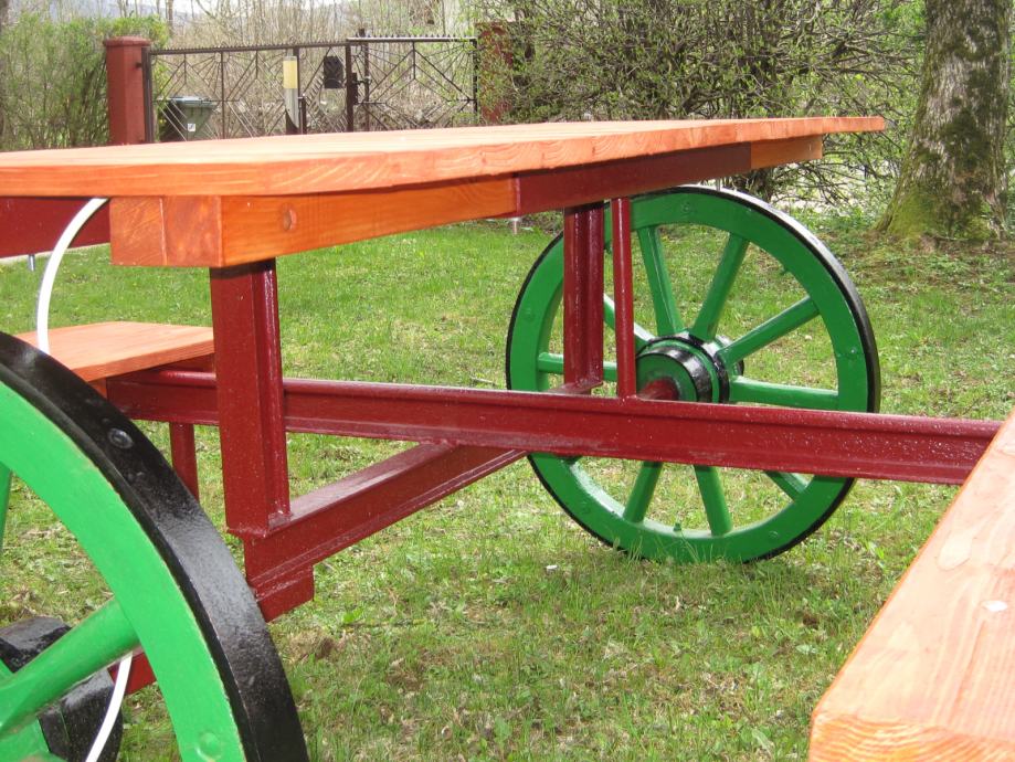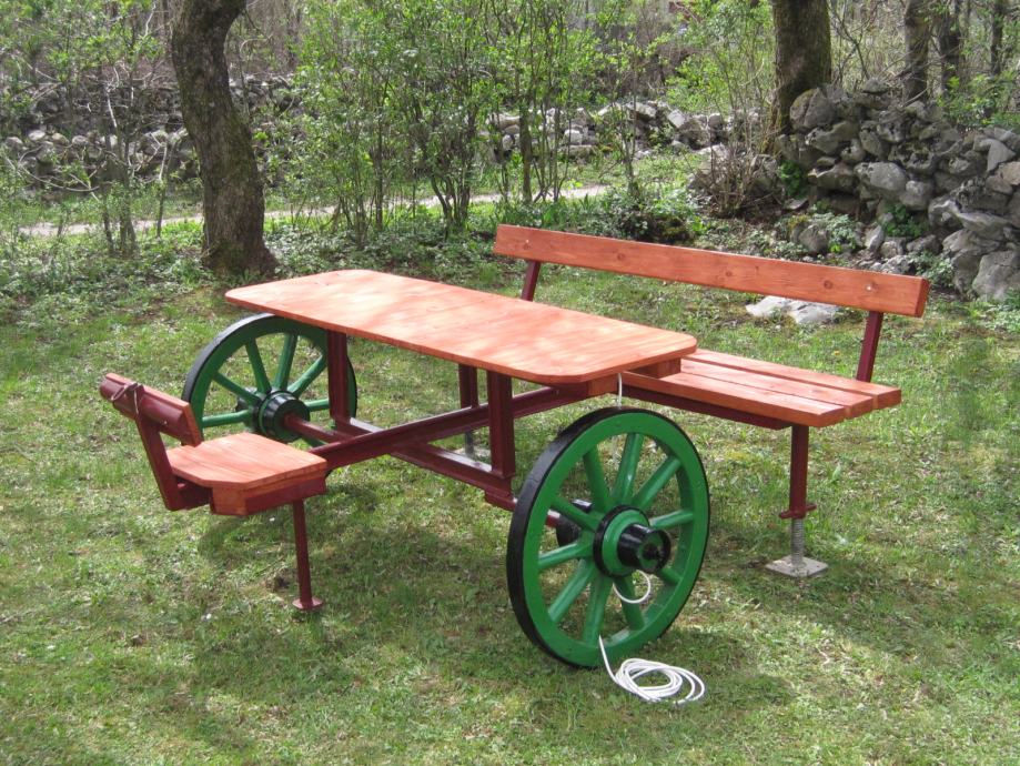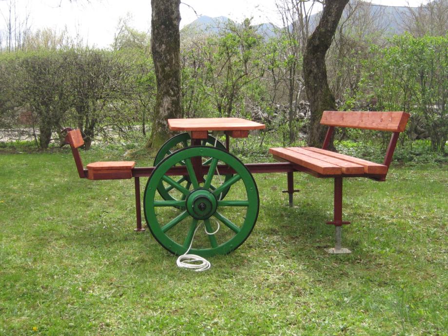 Konstrukcija je napravljena od šina usko-tračne željeznice iz doba Austro - Ugarske monarhije . Jedna šina je iz željezare " Zenica " , što je dokaz da se na ovim terenima nešto i radilo .. Ideja je bila napraviti nešto što će trajati .. Ovo je druga garnitura ., prvu možete vidjeti u mojim oglasima .. Godinama ne morate ništa dirati , snijeg , kiša sunce ostaviće tragove ali značajnije neće ništa ugroziti .. Ja takvu garnituru imam već 10 g , ove godine sam promijenio stol koji je napravljen od brodskog poda .. Gabariti su otprilike 2,20m *2,20 m .. Težina ne manje od 250 do 300 kg ..