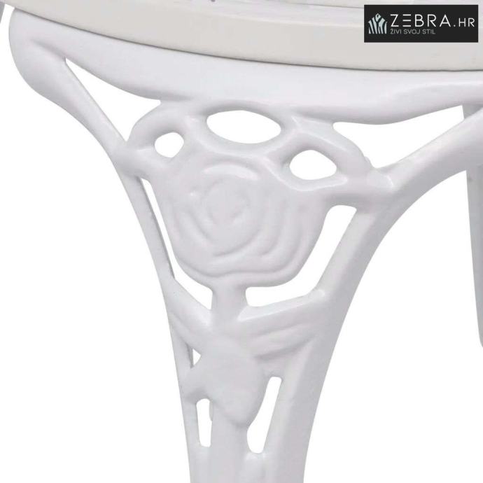 Bistro set je izrađen od visokokvalitetnog lijevanog aluminija, otpornog na vremenske utjecaje i iznimno izdržljivog. Noge od lijevanog željeza daju čvrstoću seta. Ukrasni cvjetni uzorak, dodat će romantičnu notu bilo kojem vrtu, terasi ili staklenom vrtu.