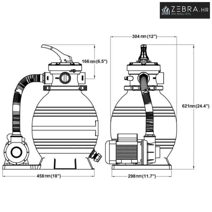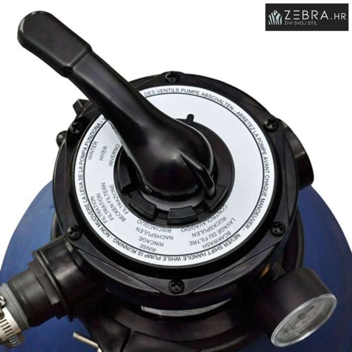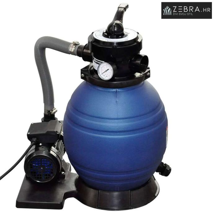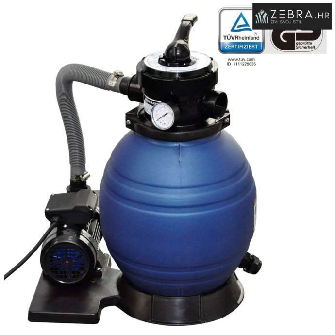 Pješčani filter može filtrirati 11000 L po satu i ima izdržljiv filter koji je otporan na hrđu i kiselinski utjecaj klorirane vode bazena. Također je opremljen sitom za odvajanje lišća i drugih velikih otpadaka. Ima ventil s više ulaza za jednostavnu kontrolu i jednostavan za čitanje, mjerač tlaka. Gornji prirubni spoj omogućuje 360 stupnjeva rotacije za jednostavnu instalaciju. Za sigurno montiranje, ovaj set uključuje bazu koje se može učvrstiti.