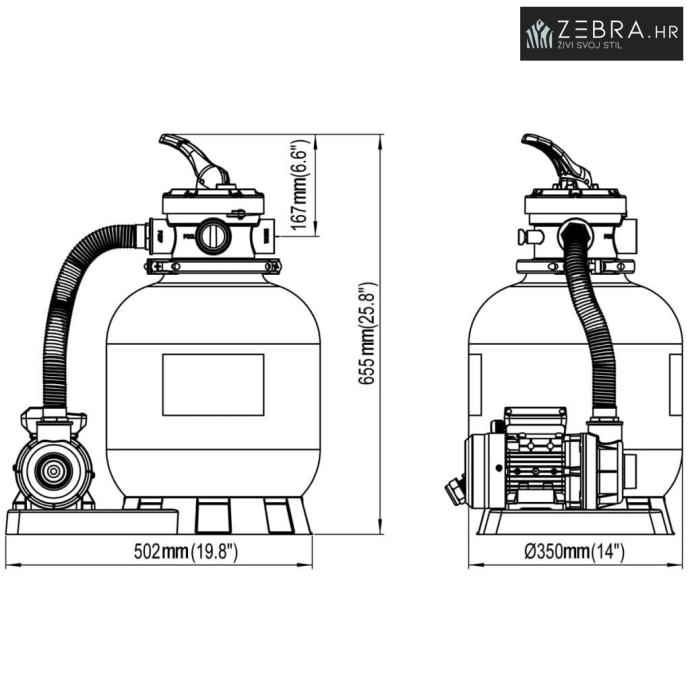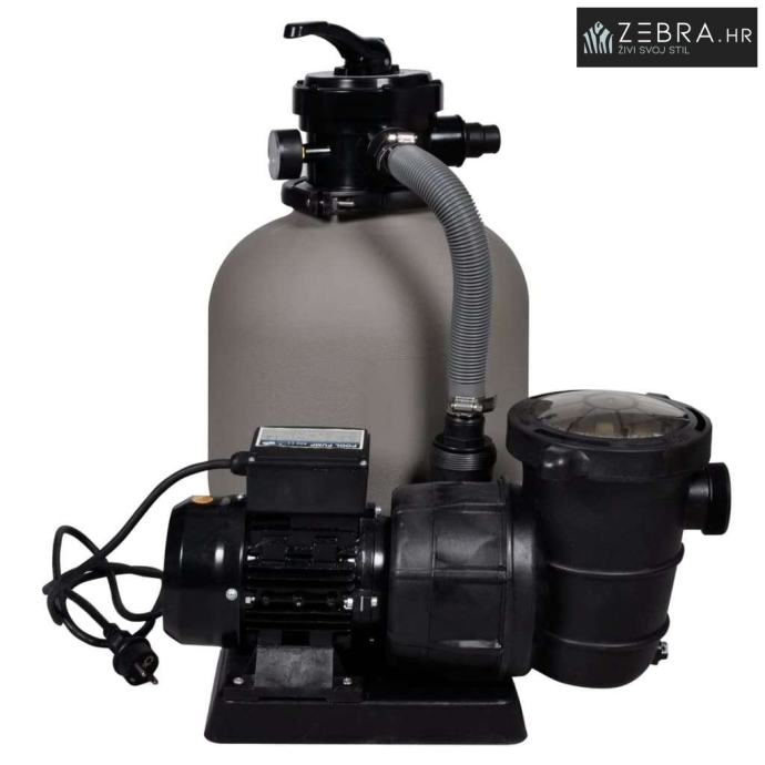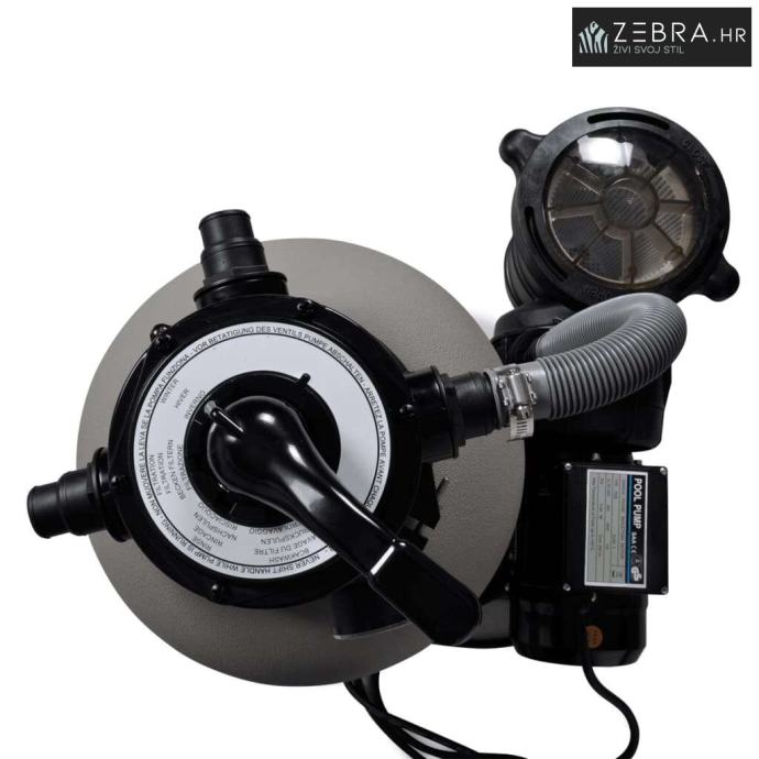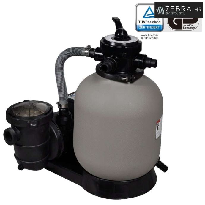 Pješčani filter može filtrirati 17000 L po satu i ima izdržljiv filter koji je otporan na hrđu i kiselinski utjecaj klorirane vode bazena. Tu je i dodatni predfilter koji zadržava prljavštinu iz grubog pijeska. Ima višenamjenski ventil za jednostavnu kontrolu i mjerač tlaka, jednostavan za očitavanje. Gornji prirubni spoj omogućuje 360 stupnjeva rotacije za jednostavnu instalaciju. Za sigurno montiranje, ovaj set uključuje bazu koja se može učvrstiti.