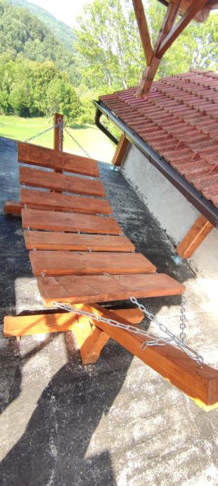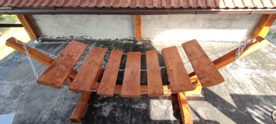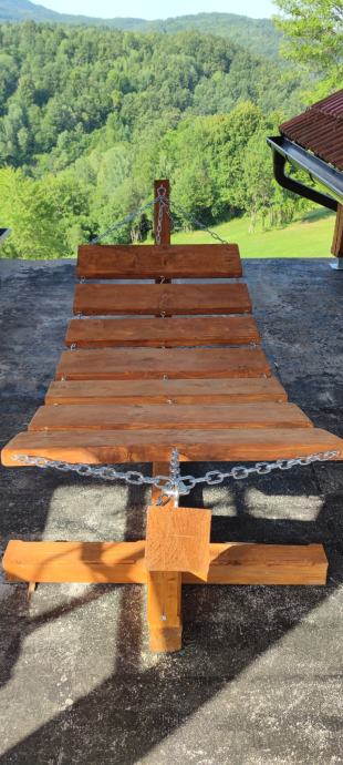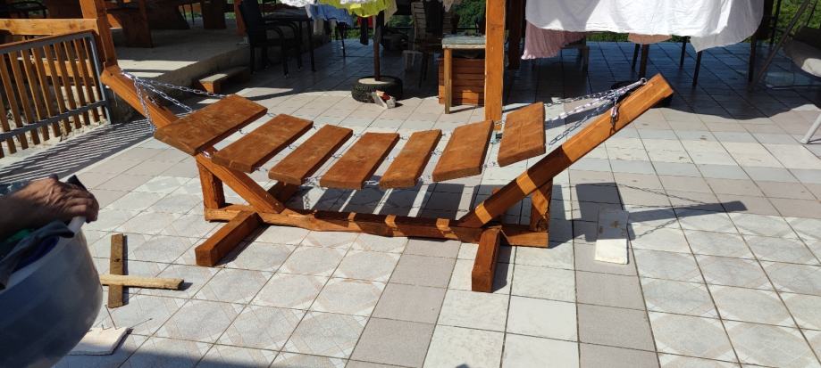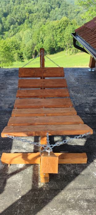 Viseča ležaljka, ručne izrade. Izradjena iz smreke zaštičena i pofarbana, moze biti sastavljena ili po djelovima.