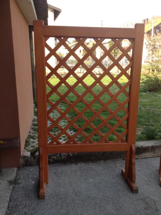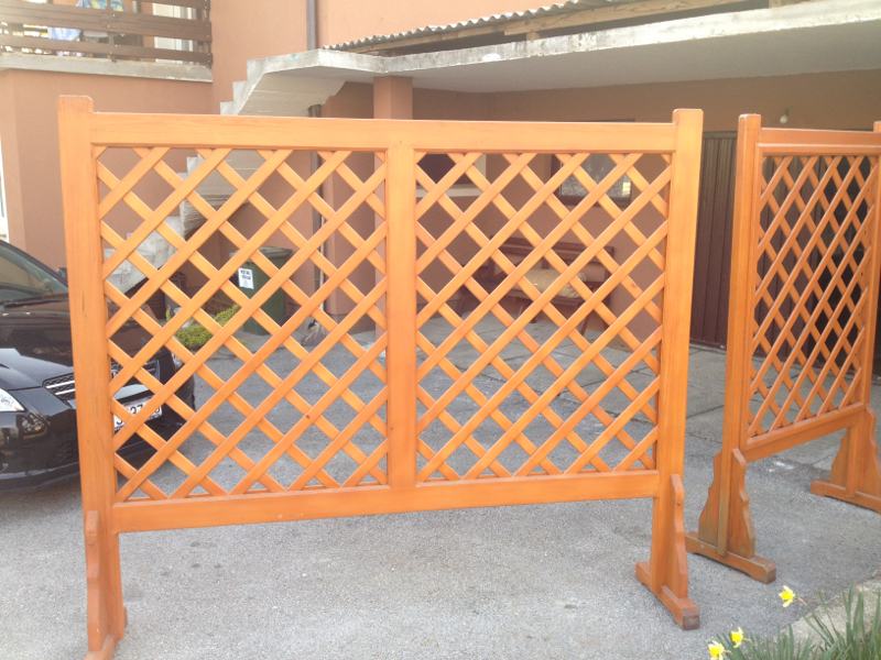 Pregrada je od masivnog drva, 4 komada po 2 m i 1 komad od 1m ukupno 9 m dužine i 2 m visine. Cijena je 350 kn/m ili za sve 3000kn.