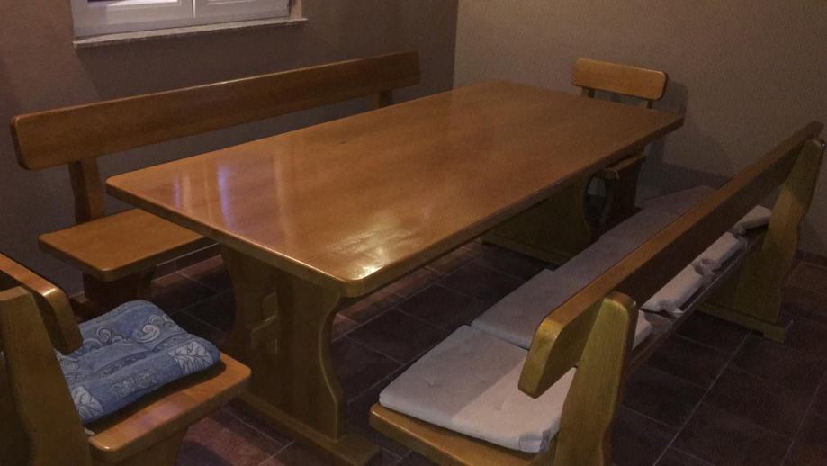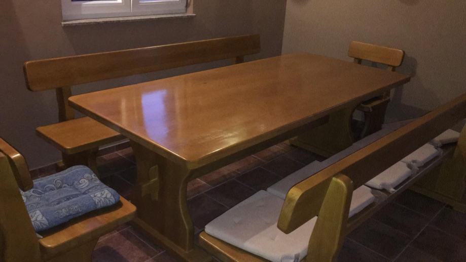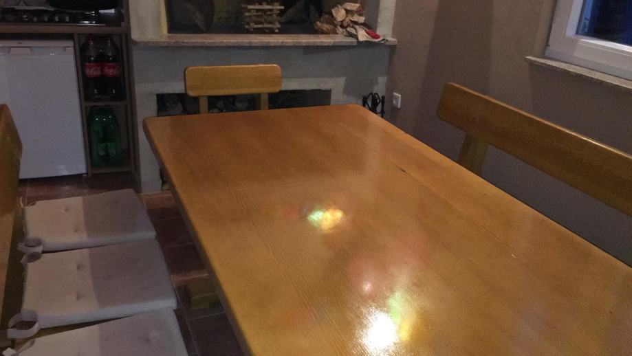 Garnitura duzine 2.2 m, sa dvije stolice. Izradena od vrlo kvalitetnog materijala smreke. Bojano 3 ruke, dvije hrasta i zavrsna ruka lak.