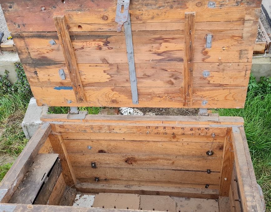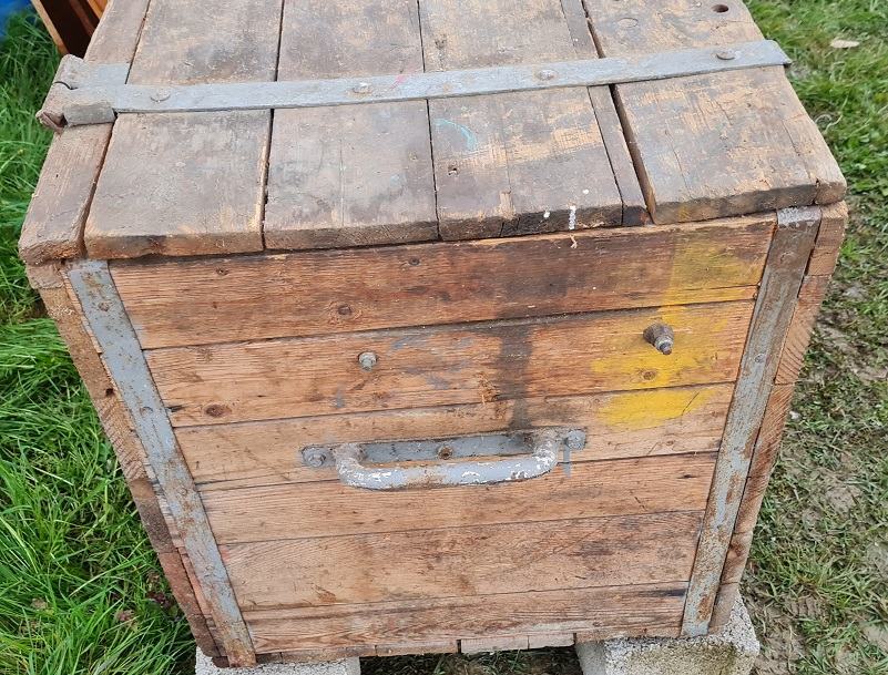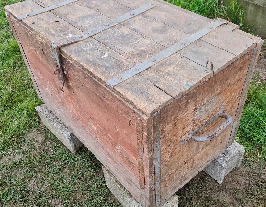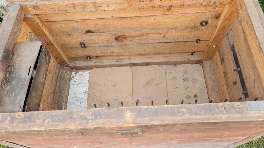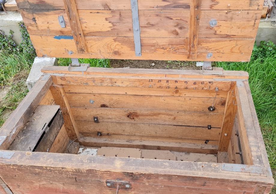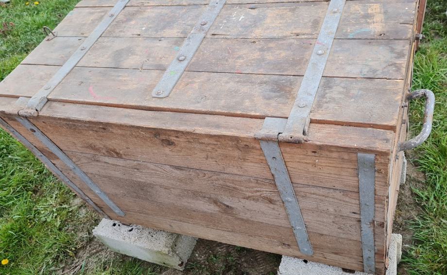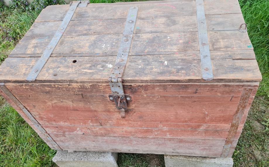 Drvena škrinja od punog drveta, služila kao spremnik za alat. Masivna, sa metalnim okovima.