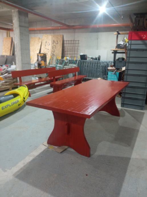Drveni stol visine 80 cm, širine 90 cm i duljine 250 cm sa dvije pripadajuće klupice. Polovan ali u dobrom stanju. Za zatvorene ili natkrivene prostore. Cijena 700 eura.