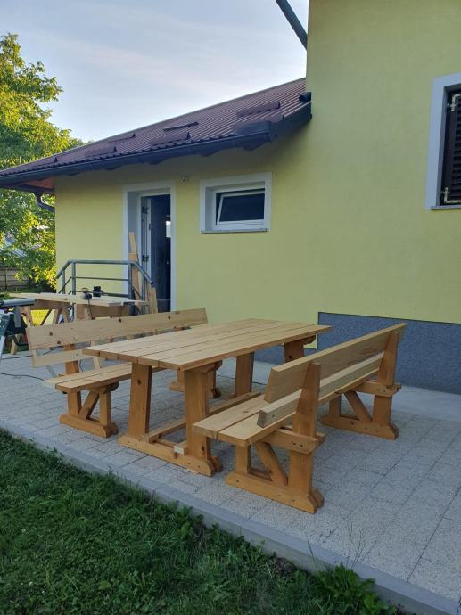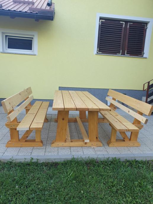 Prodajem novu drvenu vrtnu garnituru (stol + 2 klupe s naslonom).
