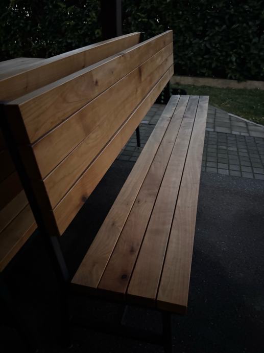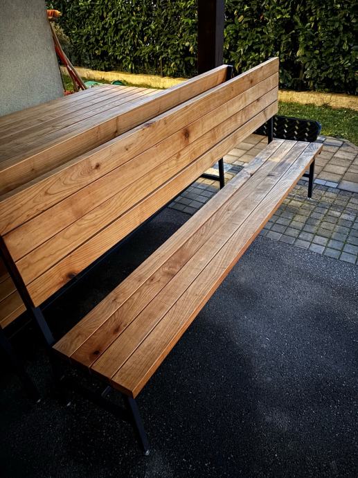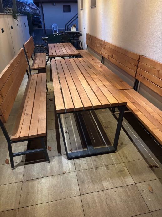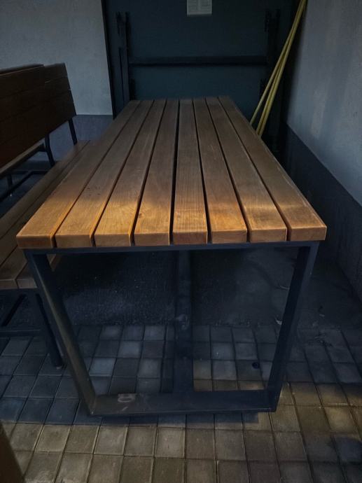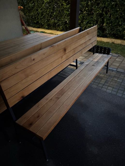Napravljeni od drva trešnje, rađeni po mjeri i ručnim radom. Napravljeni prije 3 godine i korišteni u sjenici preko ljeta, tokom zime bili skladišteni u garaži. Vide se tragovi korištenja, ništa što malo šmirglanja i čišćenja neće popraviti. Ne nudim dostavu.