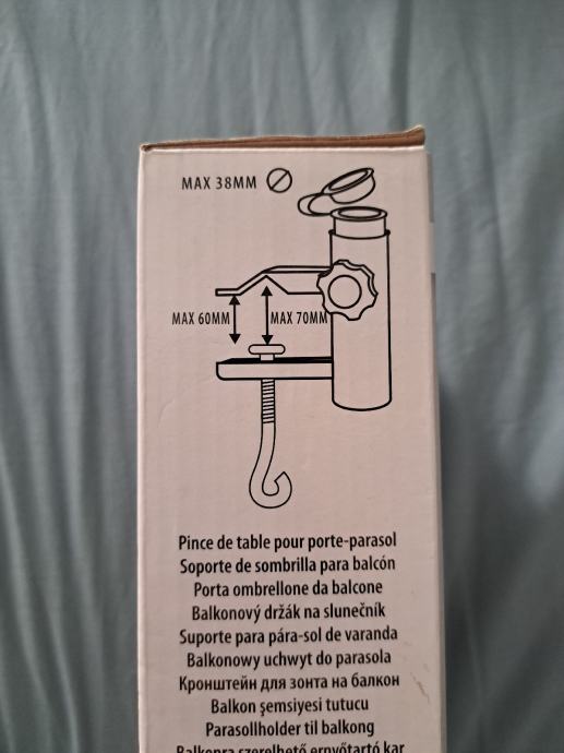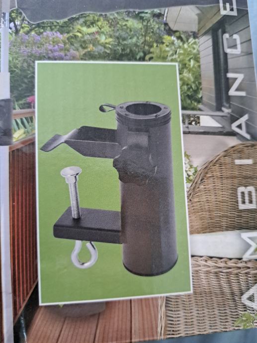 Držač se lako pričvrsti za ogradu balkona ili terase, a cilindar kroz kojega prolazi cijev suncobrana ima plastični završetak čiji se promjer može prilagoditi do 38mm širine. Bočno je i navojni stezač.