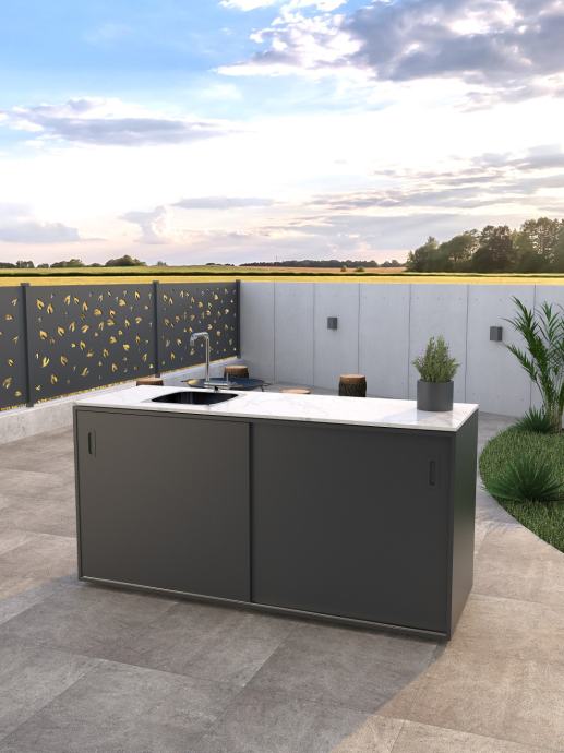 Sudoper i kuhinjska slavina izrađeni od nehrđajućeg čelika pa pogodni za vanjsku upotrebu, kuhinjska slavina ima i preklopnu funkciju;