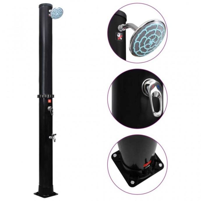 Tuš je zapremine 35 litara vode, koju zagrijava sunčeva energija, crne je boje, dolazi u kompletu s ružom, miješalicom i slavinom