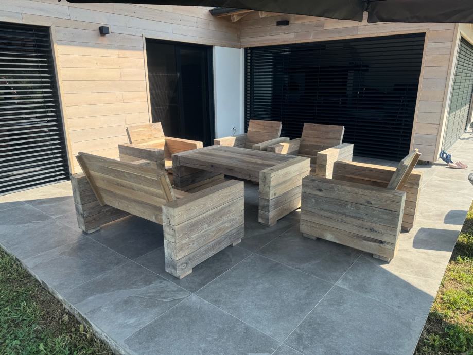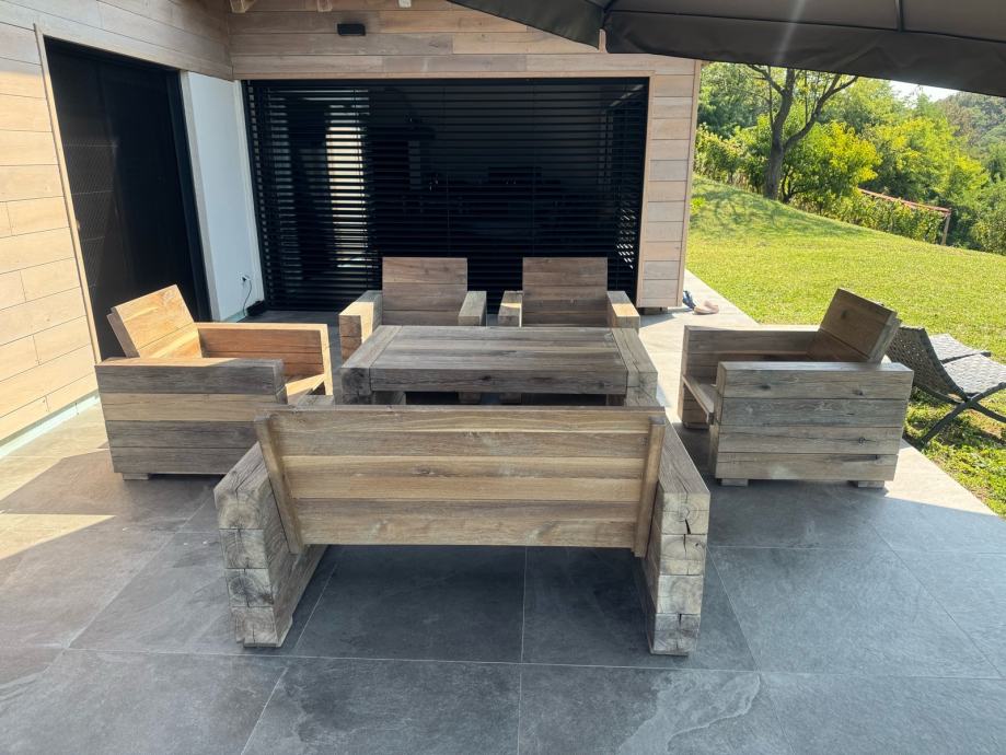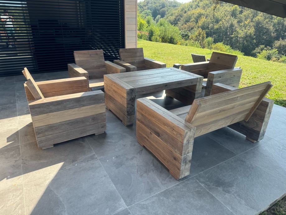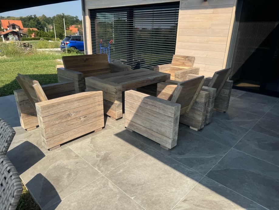 Garnitura od starih greda, fotelje, dvosjed i stol.