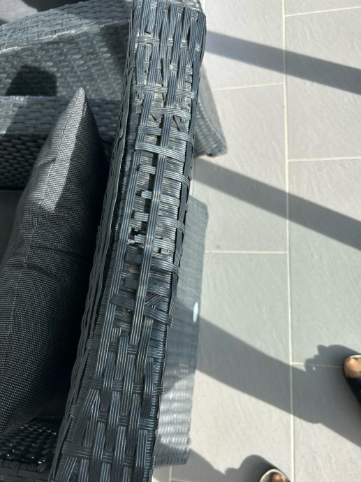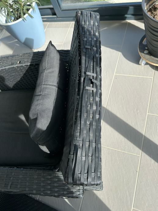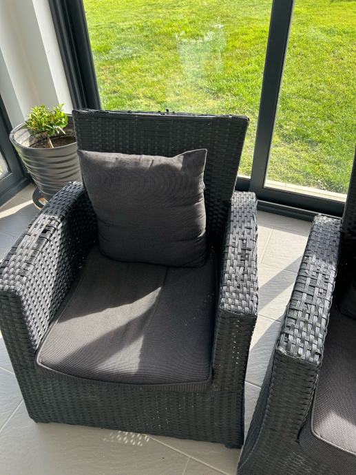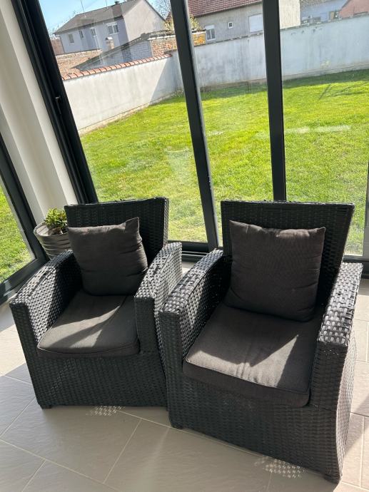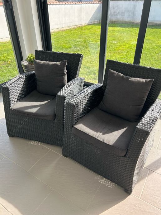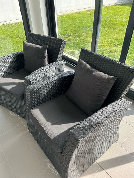 Dvije fotelje sa jastucima, antracit. Udubno za sjedit. Malo se počeo ratan odvajat, pucat, na naslonu za ruke i na gornjem rubu naslona. Ne smeta kada se koristi. Dimenzija= ukupna visina : 78 cm, visina sjedjenja: 37 cm, dubina: 53 cm, širina: 70 cm. Cijena jedne fotelje= 30,00 €. Moguća dostava uključena u cijeni, po dogovoru.