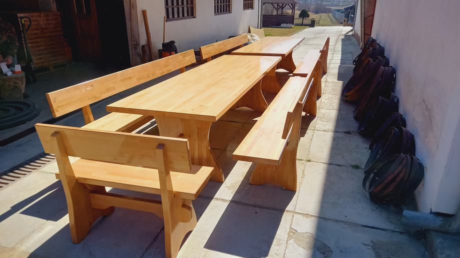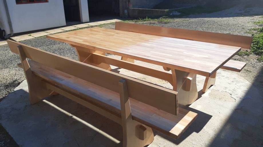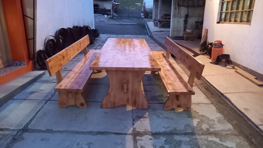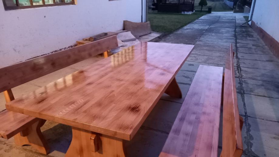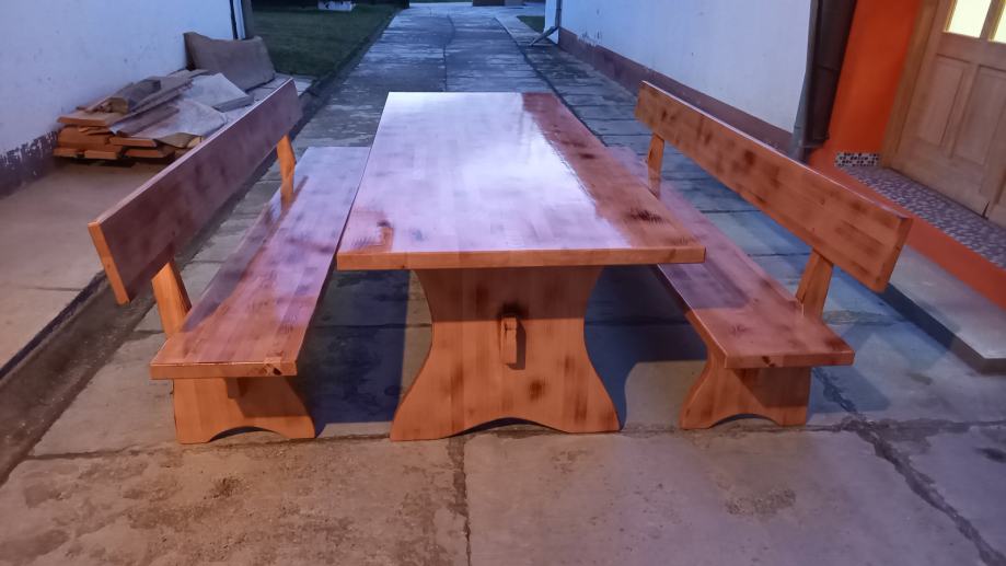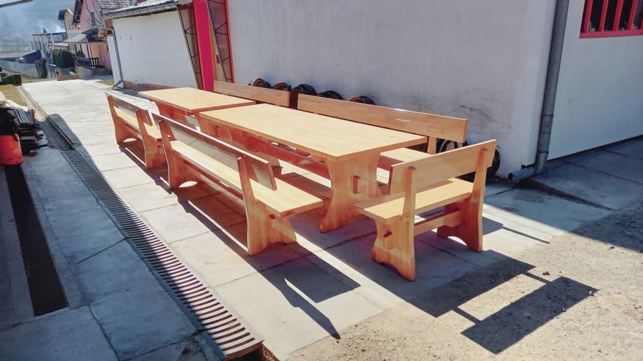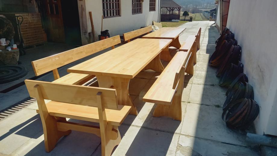 Standardna širina stola je 90 cm, a širina sjedišta klupe 35 cm. Lakirano sjajnim PU lakom za parkete (pogodnije za unutarnje prostore). Mogućnost dostave na kraće relacije uz naknadu realnih troškova.