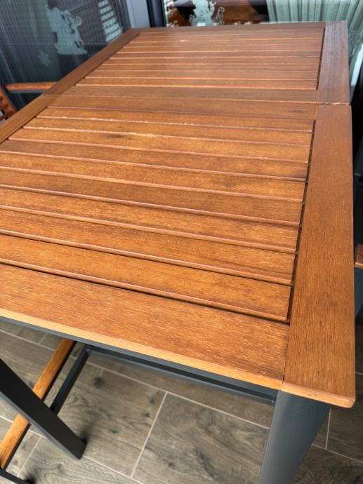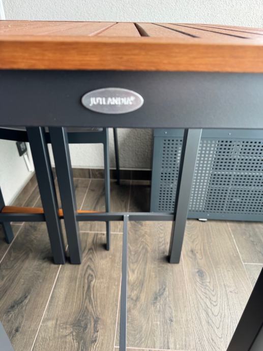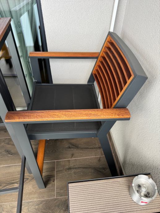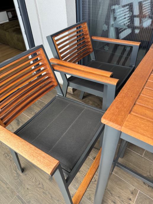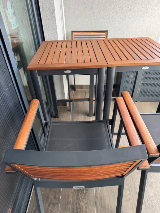 Skoro nova garnitura za terasu ili balkon , sastoji se od dva stola i tri stolice.Sjedišta su visine 65 cm ,a stolovi su visine 103 cm.Garnitura je doslovno nekorištena što se i vidi iz slika, a prodajem je zbog nedostatka prostora.