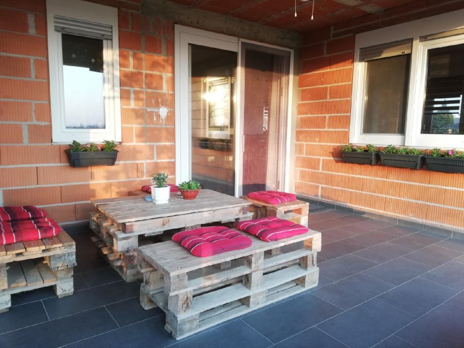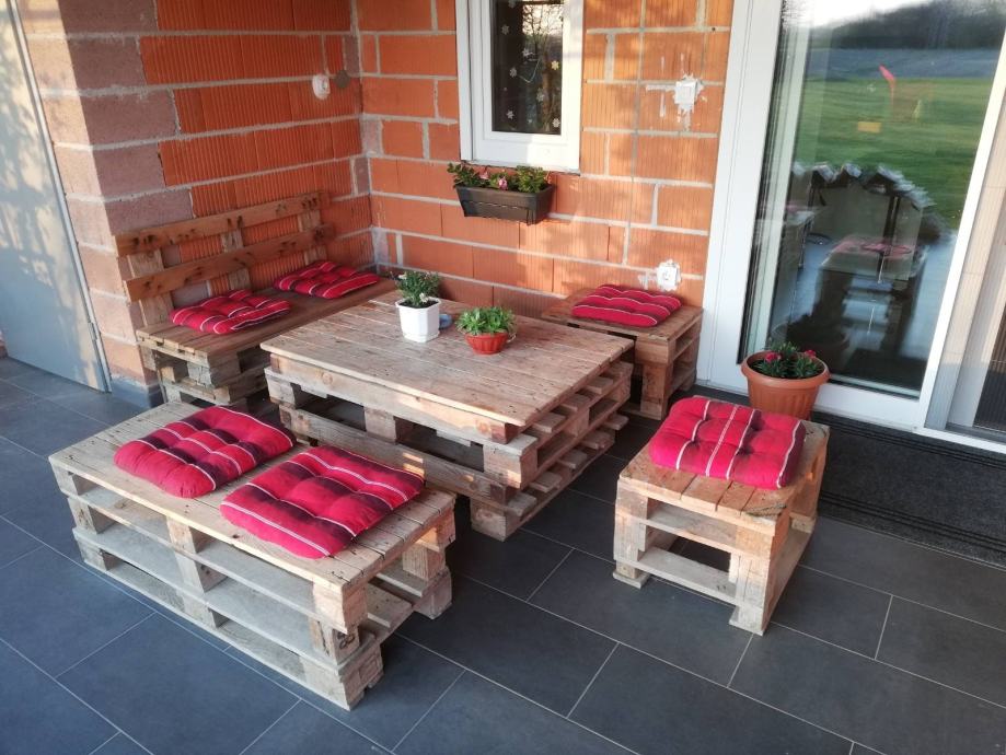 Vrtna garnitura od paleta: stol, 2 klupe (jedna sa naslonom, jedna bez naslona), 2 taburea (bez jastuka)