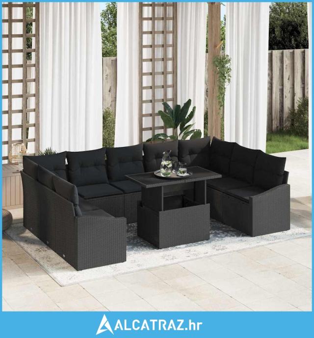 Ova 10-dijelna garnitura za vrt je savršena za svaki vanjski prostor. Pruža puno sjedenja i modernu vibru za prijatelje i obitelj. Izrađena je od kvalitetnog sintetičkog poliratana, prima do devet osoba i dolazi s udobnim jastucima i praktičnim stolom. Uljepšava tvoj balkon, dvorište ili terasu i dodaje udobnost tvojim vanjskim okupljanjima.