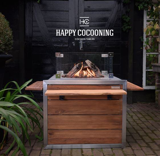 Happy Cocooning (iz Nizozemske) proizvodi premium vatrene stolove za vrt, terasu (također za barove) ili lounge. U njemu se nalazi plinski kamin s plamenikom od nehrđajućeg čelika (elektronsko paljenje), lijepo kamufliran optičkim trupcima i kamenjem lave.