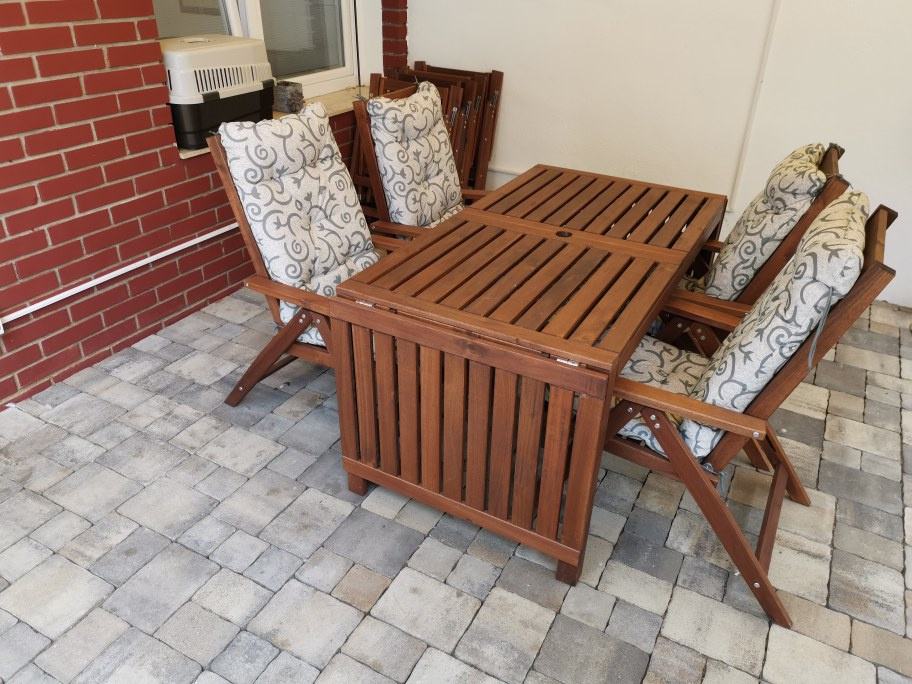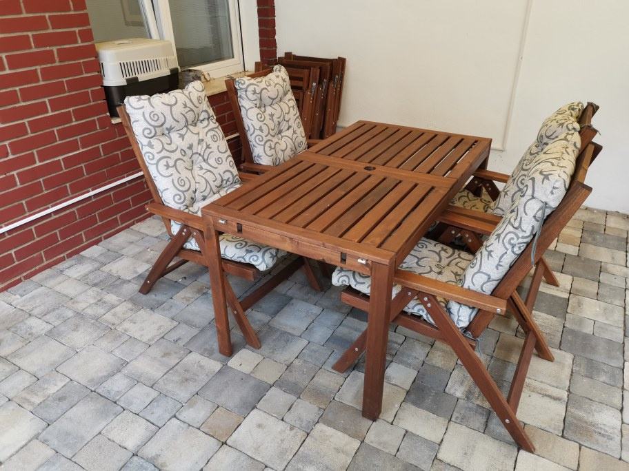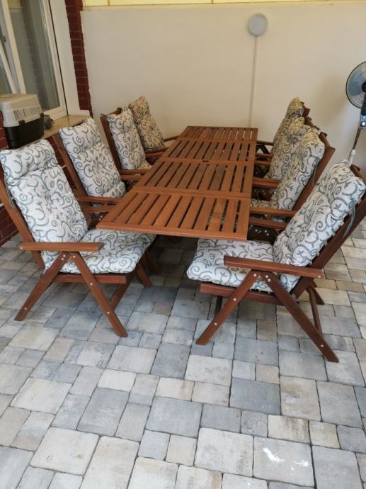 Namještaj star 2 godine (plaćeno 9.000,00 kn), u odličnom stanju. Sastoji se od stola, razvlačiv do 260 cm sa dva dodatka, 8 stolica/poluležaljki i 8 jastuka.