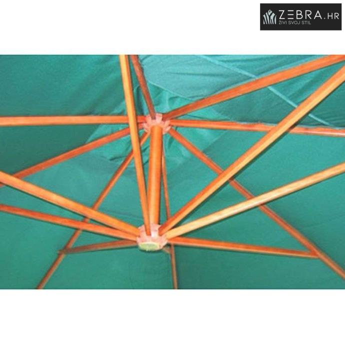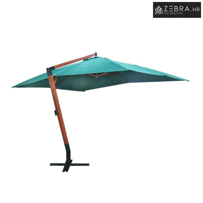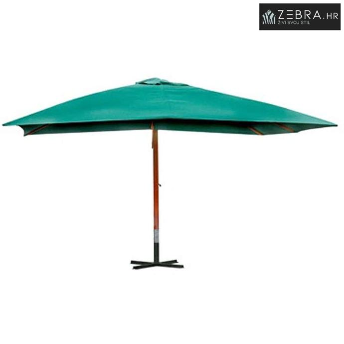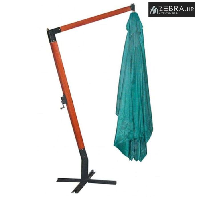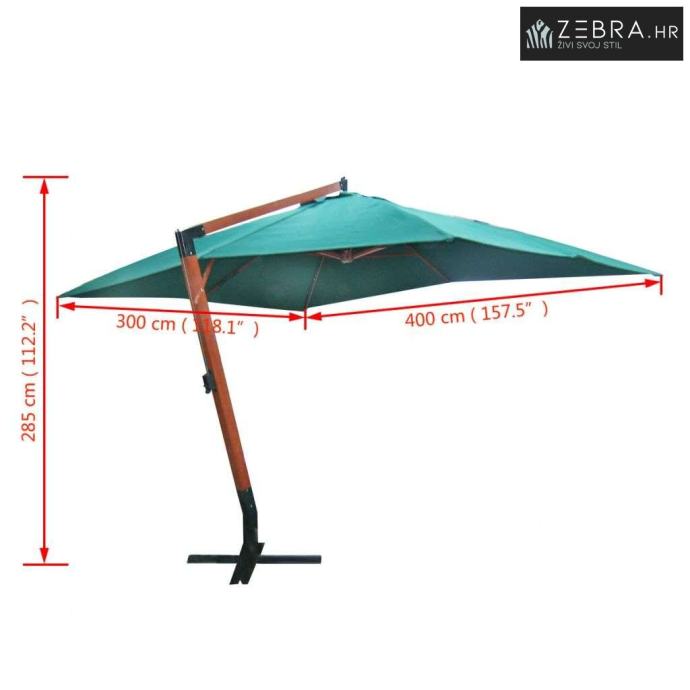 Prekrasan veliki konzolni suncobran s drvenim postoljem. Tenda ima dimenzije 3 x 4 metra. Napravljena je od zelenog poliestera koji slobodno lebdi s postolja, koje je izrađeno od modificiranog tvrdog drva. Poliester štiti i od sunca i od vlage, tako da plijesan i bakterije nemaju šanse.