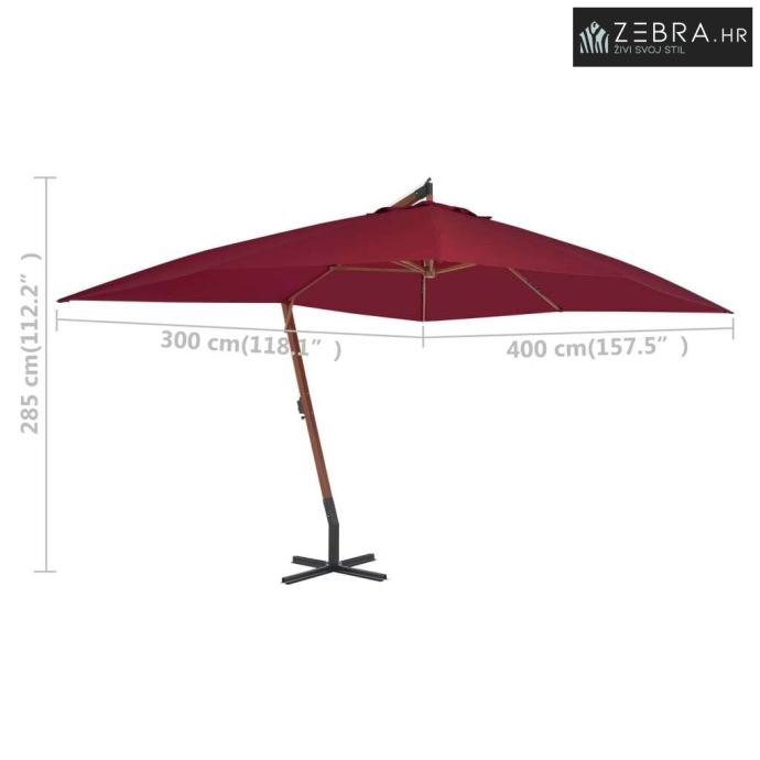 Konzolni vrtni suncobran s drvenim stupom 400 x 300 cm bordo - Crvena