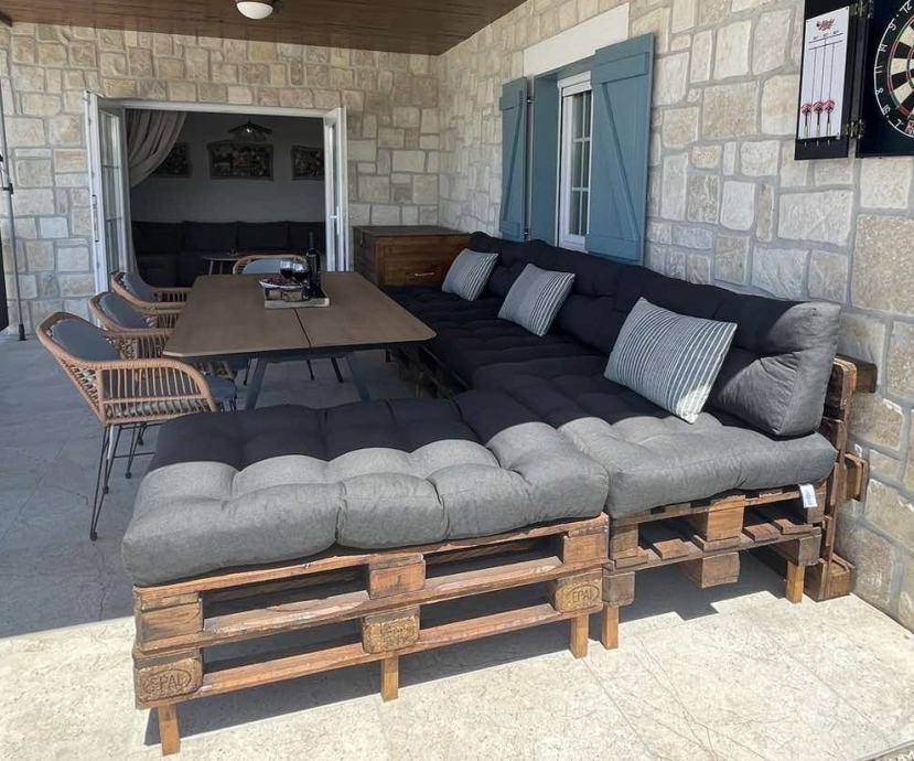 Sastavljena od paleta, 360x220cm, sa jastucima. Potrebno pretapecirati jastuke jer su posvijetlili od sunca.