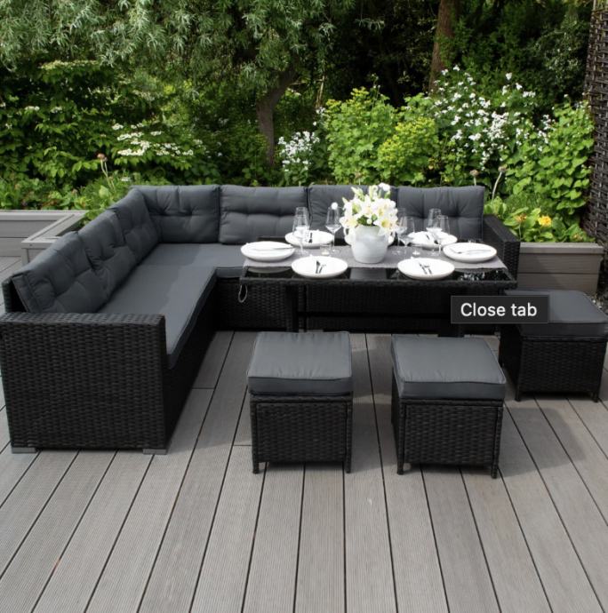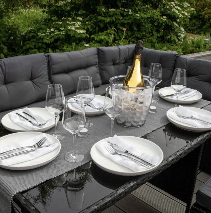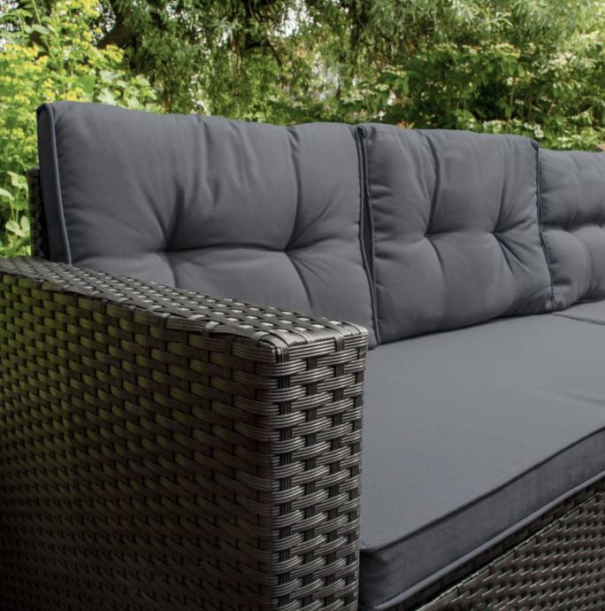 Završen u upečatljivoj crnoj boji i upotpunjen ekstra debelim prekrasnim sivim jastucima, set unosi moderan i luksuzan dodir u vaš vrt. Uz dodatak zaštitnog UV sloja, možete biti sigurni da će vaš namještaj biti zaštićen od vremenskih uvjeta tijekom cijele godine, pomažući u održavanju njegove prekrasne boje.