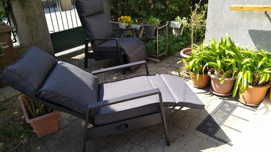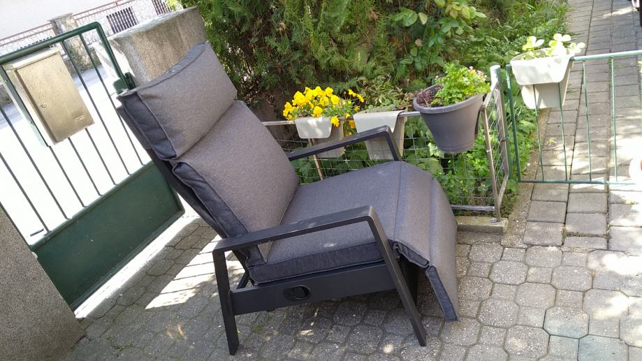 Stolica vrtna i ležaljka i ležaljka od aluminija i tekstila. Bezstupanjsko podešavanje naslona stolice i naslona za noge. uklj. luksuzni jastuk s izdržljivom, strukturirano tkanom navlakom. Š70 x V107 x D89 cm