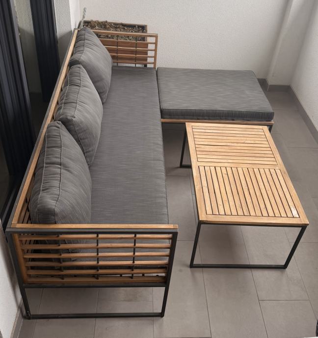 Prodajem vrtnu garnituru koja ukljucuje lounge sofu s bocnim dijelom koji se moze odvojiti (S210 cmxV70xD160 cm), lounge fotelju (S70x V70xD70 cm), stol (S60xD90 cm) i stolic (S30xD40xV61 cm). Kupljeno u Jysku. U odlicnom stanju. Razlog prodaje je da kupujemo novu.