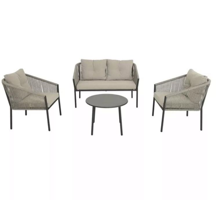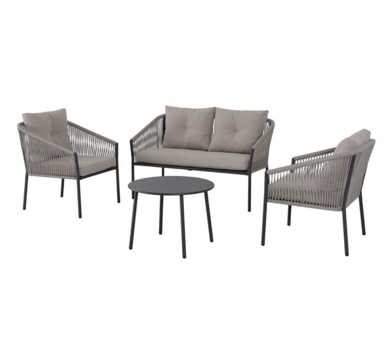 Četverodijelna garnitura od tekstilenskog užeta idealna je za opremanje vanjskih prostora poput terasa, vrtova ili balkona. Ova garnitura kombinira moderni dizajn s udobnošću, pružajući savršeno mjesto za opuštanje i druženje s prijateljima i obitelji.