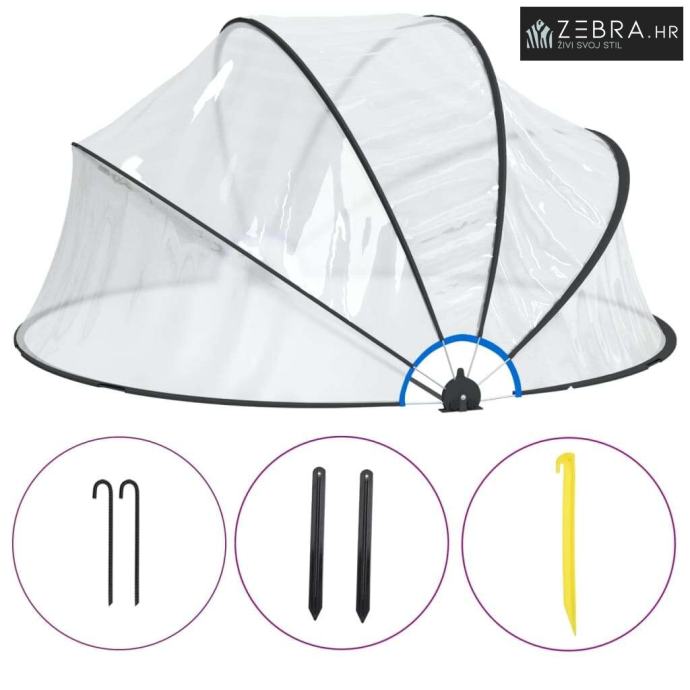 Čvrsto osiguran pribor: Za čvrsto sidrenje kupole u tlo, isporuka dolazi sa šiljcima za tlo i kukastim čavlima za tlo. Ne morate se brinuti da će vjetar odnijeti bazensku kupolu.