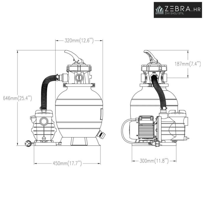 Ovaj pješčani filtar s crpkom dizajniran je za cirkulaciju vode u vašem bazenu i održavanje čistoće. Možete ga napuniti filtarskim pijeskom ili filtarskim kuglicama.