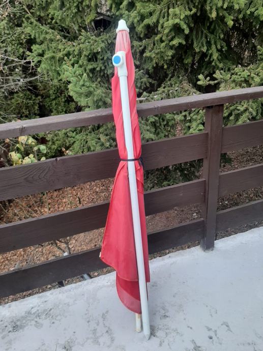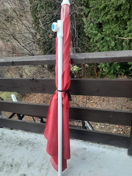 Prodajem crveni platneni suncobran sa metalnim stalkom (neoštećen, kvalitetan).