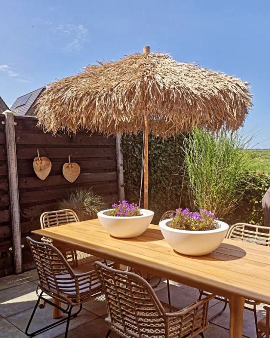 Ovaj visokokvalitetni suncobran od bambusa s ručno tkanim krovom od lišća banane, savršen je za filtriranje štetnih UV zraka i štitit će vas od sunca u vašem vrtu, na terasi ili u dvorištu. Također se može upotrebljavati u barovima ili restoranima.