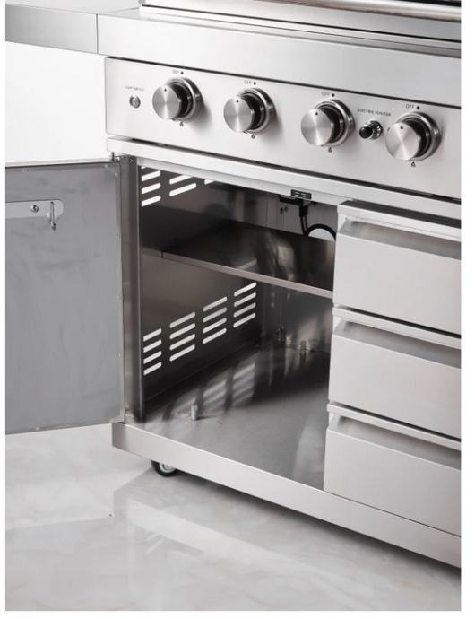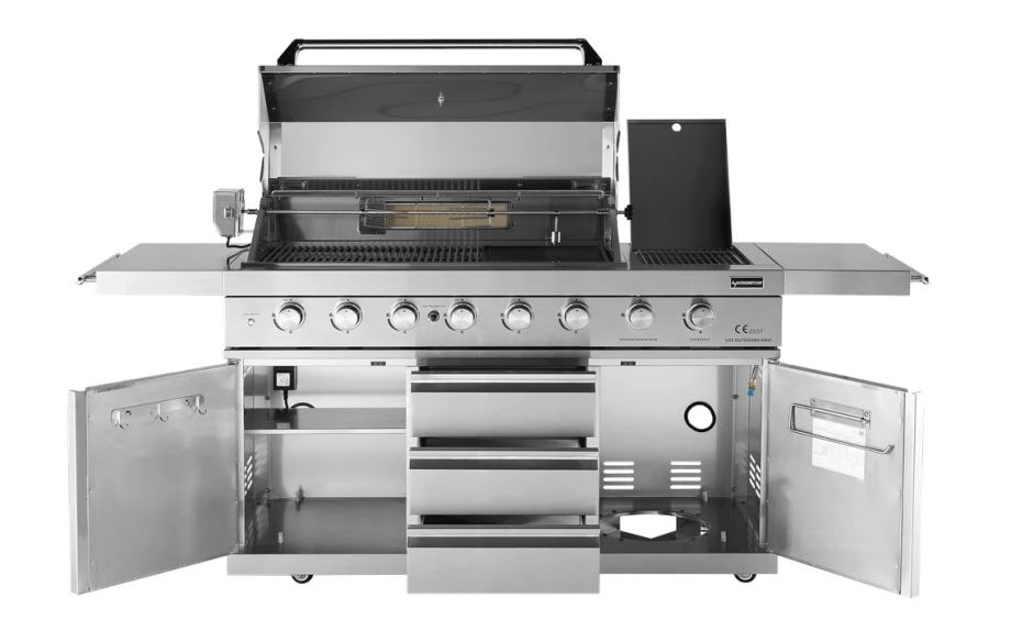 4 kotača omogućuju vam da roštilj lako premjestite gdje god želite i zaključate ga. Izvrstan prostor za pohranu s 3 velike ladice i 2 ormarića s dovoljno prostora za kuhinjsku opremu, pribor i plinsku bocu. Iza vrata ormarića pronaći ćete i praktične detalje poput držača za papirnate ručnike i kuka za vješanje alata za roštilj, rukavica za pećnicu, ručnika i još mnogo toga. Ovaj roštilj bit će srce ekskluzivnog vanjskog kuhinjskog prostora vašeg doma!