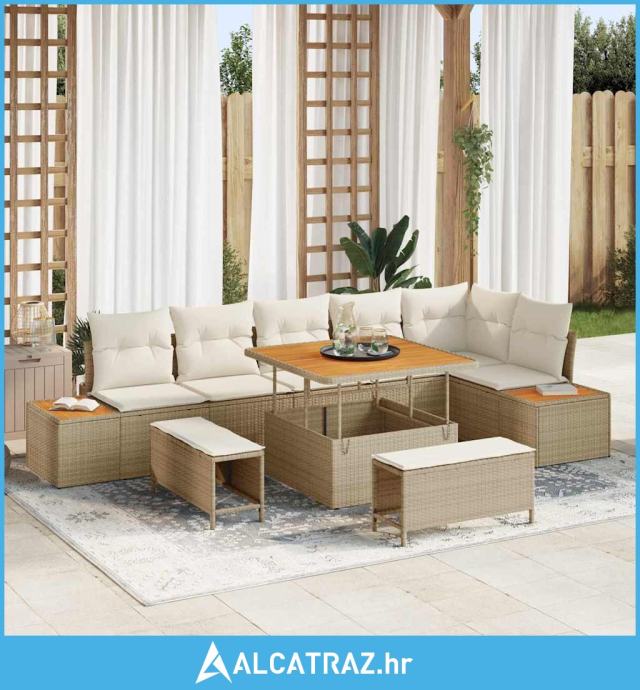 Set od 9 dijelova Vrtne Sofe s Jastucima Bež Poly Ratan Akacija - NOVO