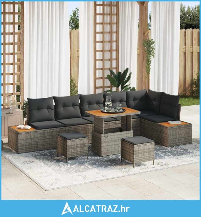 set vrtnog kauča od 9 dijelova s jastučićima, sivi poli ratan akacija
