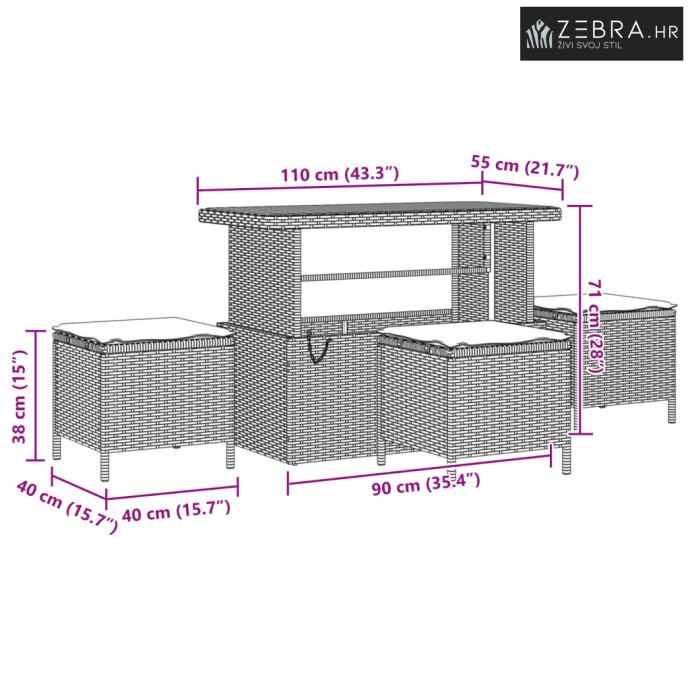 Jastučići i jastuci Sa udobnim poliester jastučićima, ovaj set osigurava opuštanje i udobnost. Vodootporni jastučići zadržavaju oblik i boju, idealni za vanjsku upotrebu u sunčanim danima ili iznenadnim pljuskovima. Ovi detalji podižu tvoje iskustvo sjedenja, pružajući ti podršku i da daju dašak luksuza.