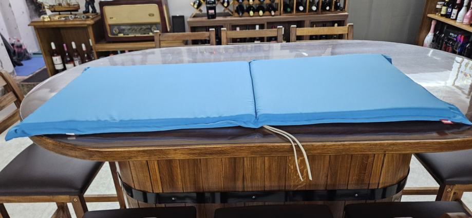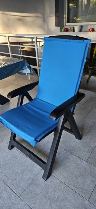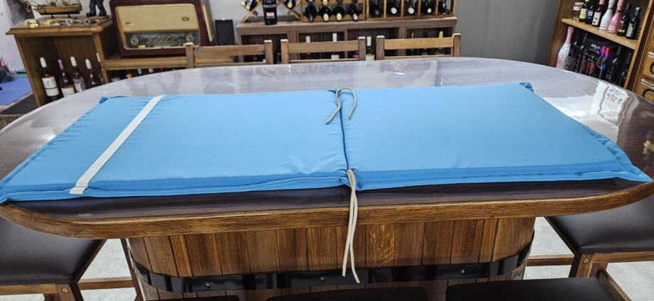 Prodajem 8 kom. sjedalica - jastuka za stolice sa višim naslonom, debljine 3 cm, dimenzije 110 x 46 cm, tirkizne boje. U cijelosti sačuvane, stare 3 mjeseca. Sve imaju leđnu gumu i vezice za bolje sjedenje. Koristile se pod vrtnom terasom. Cijena je za jednu sjedalicu.