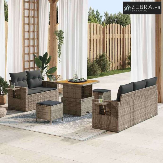 Kvalitetni materijali: Set je od izdržljivog Poliratana koji ima glatku, atraktivnu teksturu i odličnu otpornost na vremenske uvjete. Masivno bagremovo drvo osigurava robusnost i prirodan izgled, pa ovo nije samo funkcionalno, nego i lijepe estetske vrijednosti u svakom vanjskom prostoru. Prilagodljive komponente: Svaki komad u setu osmišljen je da bude modularan, što znači da možete prilagoditi raspored kako vam najbolje odgovara. Ova fleksibilnost dizajna poboljšava svestranost i omogućuje lako uklapanje u različite vanjske rasporede bez ograničenja. Podesive značajke dizajna: Set ima stol s podesivom visinom koji prelazi iz stola za kavu u blagovaonski stol. Ova prilagodljivost čini ga savršenim za različite prilike, od opuštajućih popodnevnih čajeva do veselih večera na otvorenom, pokazujući njegovu sveprisutnu funkcionalnost. Lagan i mobilan: Ključni dijelovi su od lakih materijala, što olakšava premještanje i reorganizaciju, omogućujući vam da prilagodite svoj vanjski raspored prema potrebi i olakša čišćenje i održavanje. Izdržljivost na otvorenom: Materijali otporni na UV zračenje jamče dugotrajne performanse bez izbljeđivanja, čak i na jakoj sunčanoj svjetlosti. Ako koristite zaštitni pokrov, set će i dalje izgledati sjajno, produžujući mu vijek trajanja i poboljšavajući izdržljivost kroz cijelu godinu. Boja: Siva