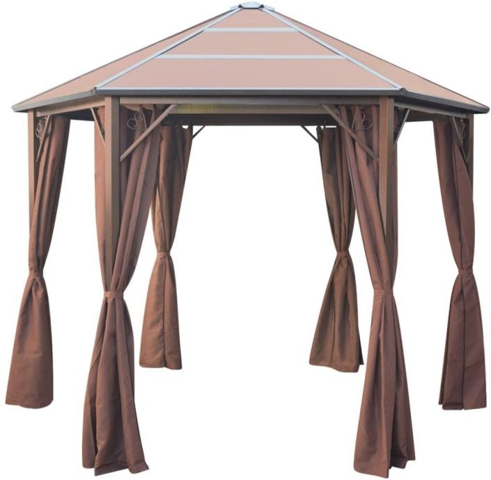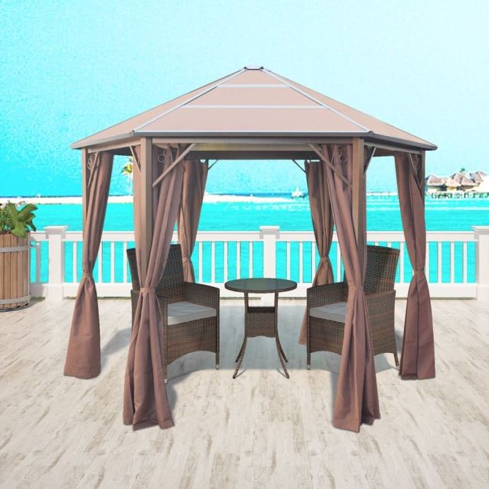 Ova šesterokutna sjenica sa zavjesama, elegantnog dizajna, idealna je za bilo koji događaj na otvorenom, kao što su večere, vjenčanja, roštiljske zabave, festivali i slično. Možete je postaviti u svom dvorištu kao ogroman lijep suncobran za vašu obitelj i goste.