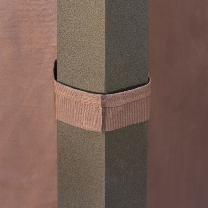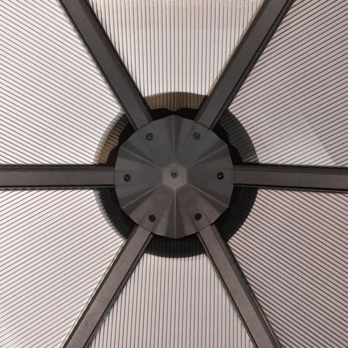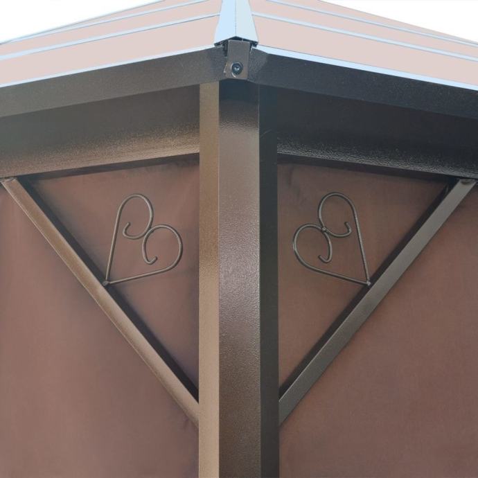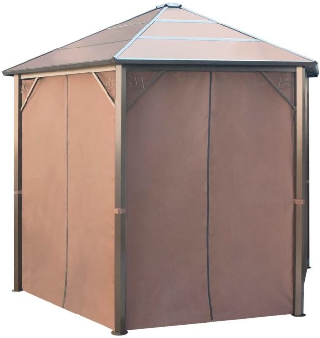 Sjenica ima čvrst aluminijski okvir. Krov je izrađen od PC ploča debljine 6 mm, otpornih na UV zrake. Zavjese, izrađene od poliestera otpornog na vremenske utjecaje, mogu biti zatvorene patentnim zatvaračima tijekom lošeg vremena ili za privatnost.