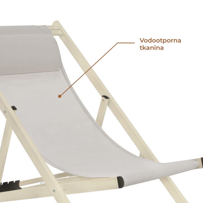 Ležaljka je presvučena textilene materijalom – izuzetno izdržljivom mrežastom tkaninom otpornom na vlagu, UV zrake i habanje. Ugodna je na dodir, brzo se suši i pruža optimalnu prozračnost, što je čini idealnim izborom za vanjske prostore. Podesivi naslon omogućuje različite položaje sjedenja, pružajući dodatnu udobnost tijekom korištenja. Uz ležaljku dolazi i uklonjivi jastuk, koji pruža dodatnu potporu i udobnost, a lako se skida prema potrebi.