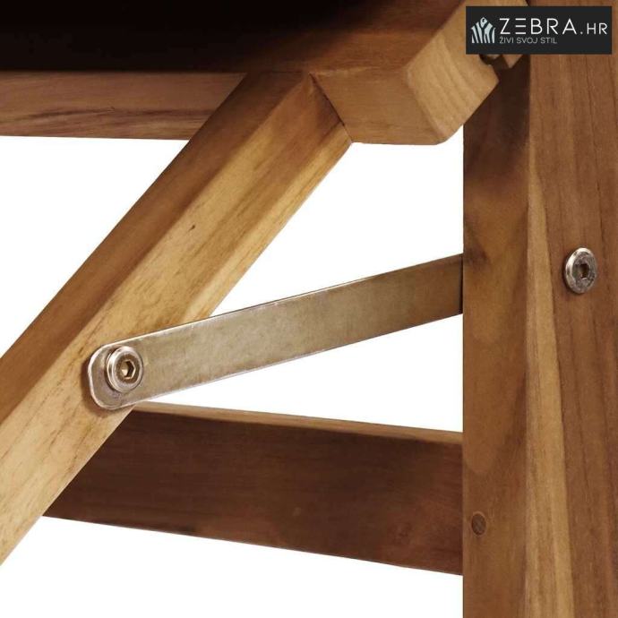 Robusnost tikovine Izrađena od masivne tikovine, poznata po svojoj izdržljivosti i elegantnom izgledu, ova stolica je otporna na vlagu i vremenske uvjete. Snažna konstrukcija garantira udobnost i sigurnost.