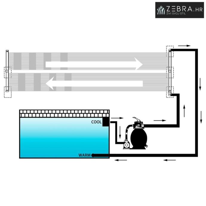 Ugradnjom ovog grijača, voda u bazenu cirkulira kroz solarne kanale i vraća se u vaš bazen fino topla. Kompatibilan je s većinom crpki za bazen. Može se montirati na krov/nosač ili jednostavno položiti na tlo uz bazen.