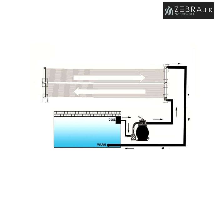 Ovaj solarni grijač bazena upija sunčeve zrake, pretvara ih u toplinu i održava vaš bazen ugodno toplim. Povećava temperaturu vode u bazenu do 10 stupnjeva. Uz instalaciju ovog grijača, bazenska voda cirkulira kroz solarne kanale i vraća se u bazen fino topla.